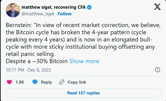 • Bernstein目前目标是2026年达到150,000美元,2027年周期峰值达到200,000美元,同时维持2033年100万美元的目标,认为ETF需求和受限供应仍支持长期上涨趋势。