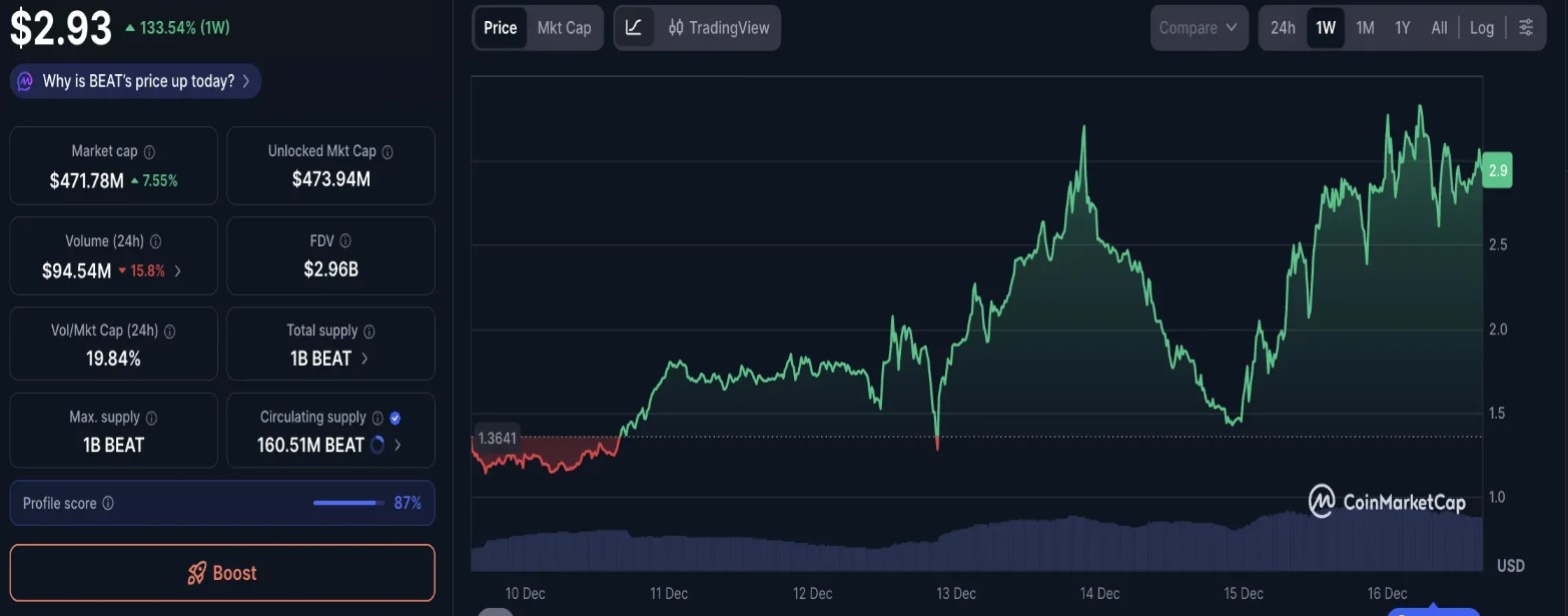 Audiera 的BEAT 代币于2025 年12 月16 日升至约$2.97,周增幅达133%,24 小时交易量为$9450 万,市值排名第90,市值为$4.76 亿。
