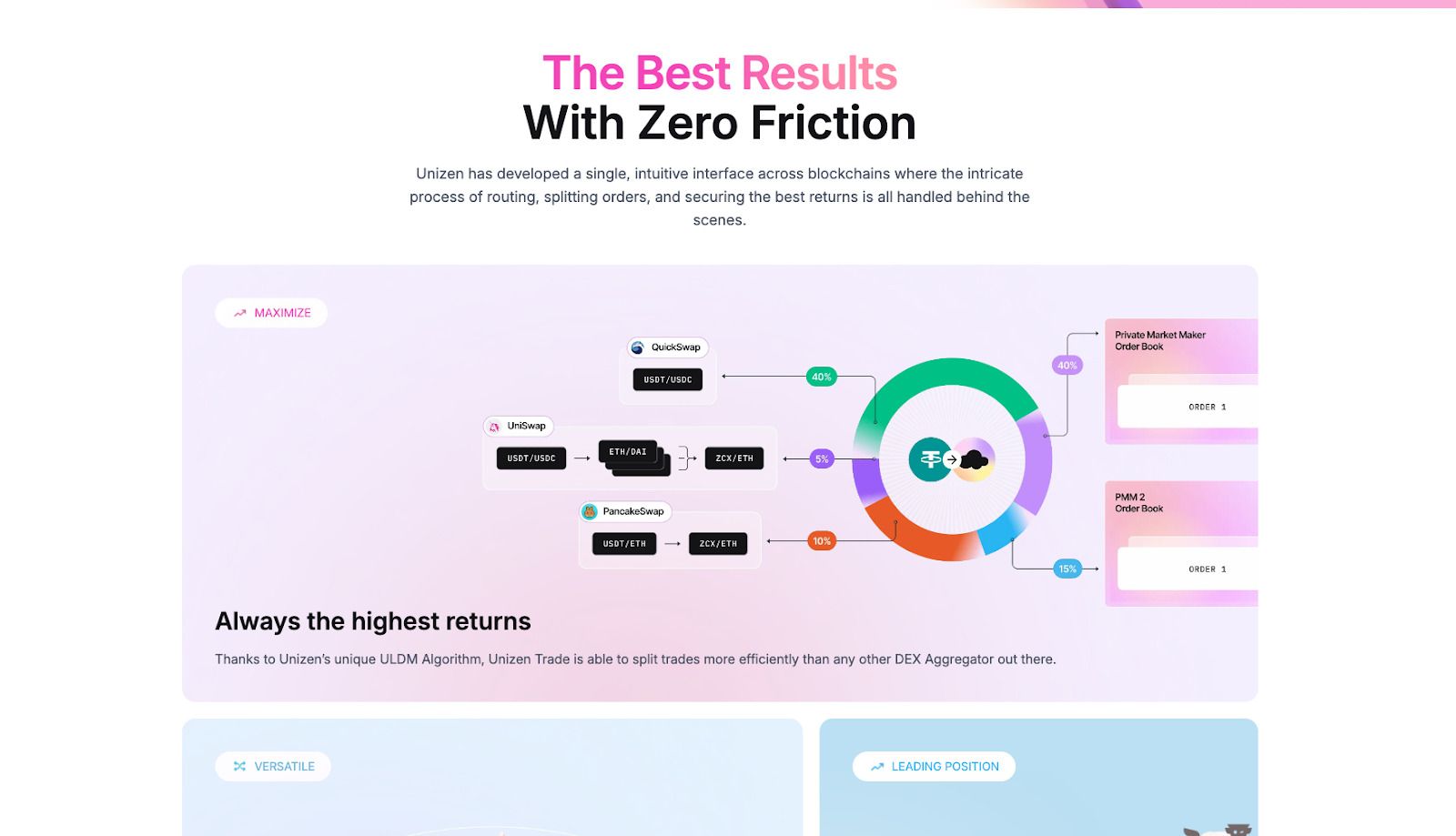 - 使用 Unizen 的路由逻辑和 ULDM 算法实现跨链 DEX 聚合,以拆分交易并最大程度地减少 EVM 和其他链上的滑点。