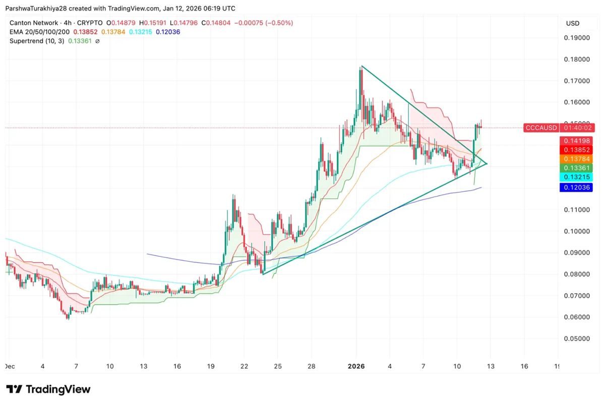 CC 价格在 0.14804 美元附近盘整,形成 0.13 美元至 0.15 美元之间的对称三角形,此前在 12 月下旬曾飙升至 0.18 美元。0.13852 美元、0.13784 美元、0.13215 美元和 0.12036 美元的 EMA 均线紧密聚集。0.13361 美元的超级趋势线提供支撑。