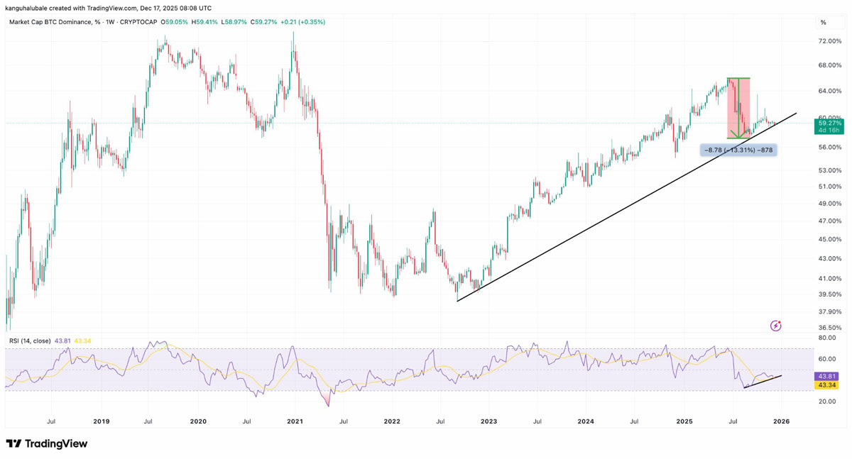 截至发布时,比特币的主导地位为59.27%,这表明目前仍处于比特币牛市阶段。