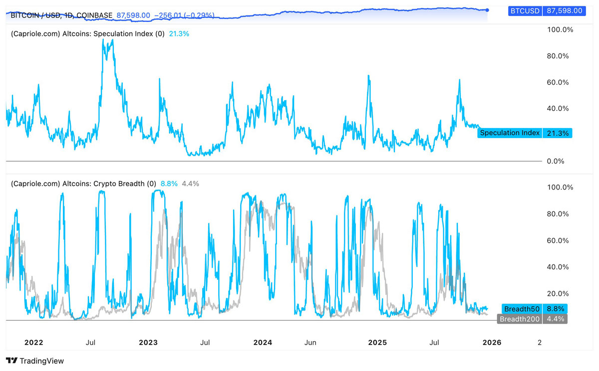 此外,加密市场广度——一项衡量市场强度的指标——显示,仅有8%的山寨币交易价格高于其50日移动平均线,这表明山寨币市场极度疲软。