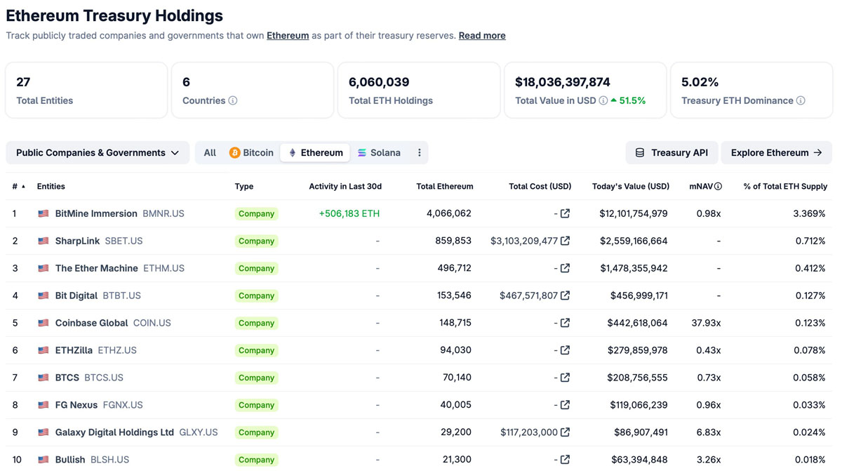 以太坊也吸引了投资者的类似需求。根据CoinGecko数据, 27家上市公司合计持有约600万枚ETH,约占该代币流通供应量的5%。