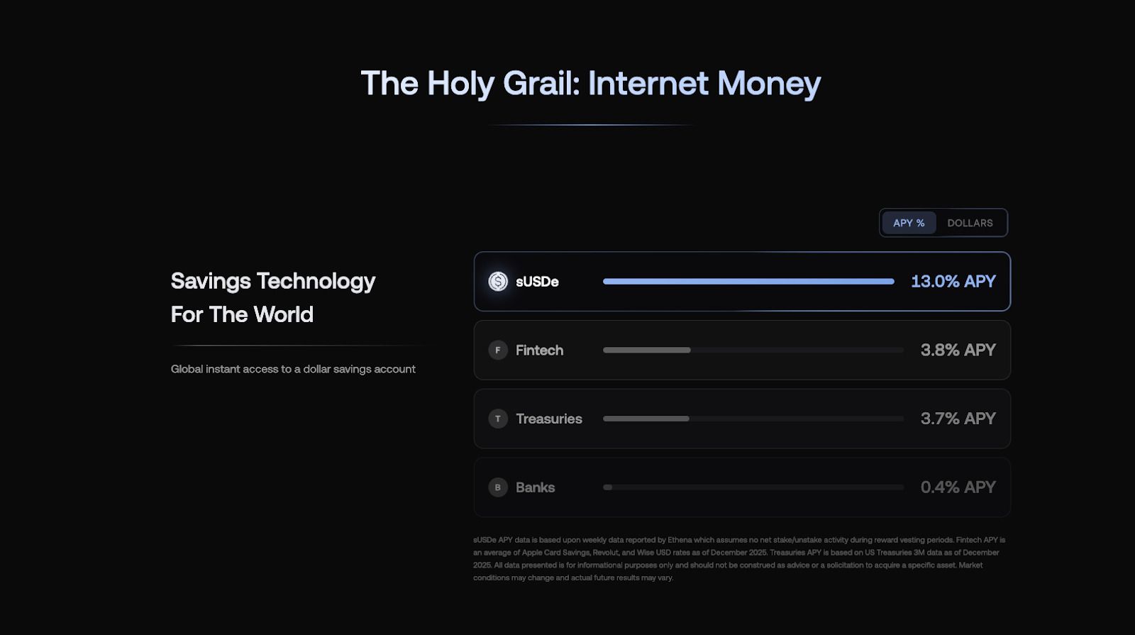 - 合成美元 (USDe):对加密质押资产进行 Delta 对冲,旨在在没有传统银行存款的情况下维持软美元挂钩。
