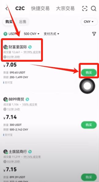 然后欧易平台会为我们筛选出符合要求的商家。我们要在下方找成交量和成交率都比较高的商家来进行交易。比如“财富里国际”这一家,他有一个12000单的成交量,同时他的好评率是99.99%,我们就可以跟这家来进行购买,点击他后面的【购买】。