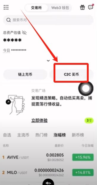 认证完成之后就可以在欧易尽心购买币交易了。回到欧易首页,点击【C2C买币】。
