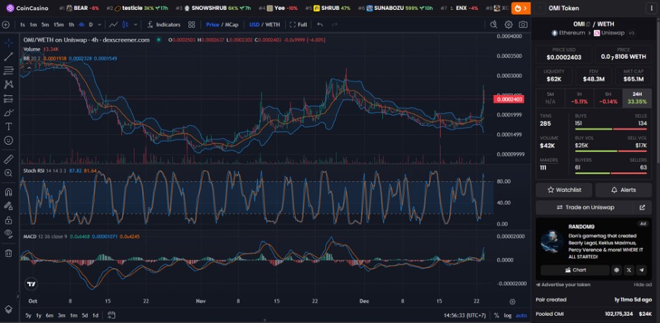 OMI 代币运行在以太坊区块链上,并可在多个平台上进行交易,包括Uniswap。其流动性为62,000 美元,完全稀释估值(FDV) 为4830 万美元。