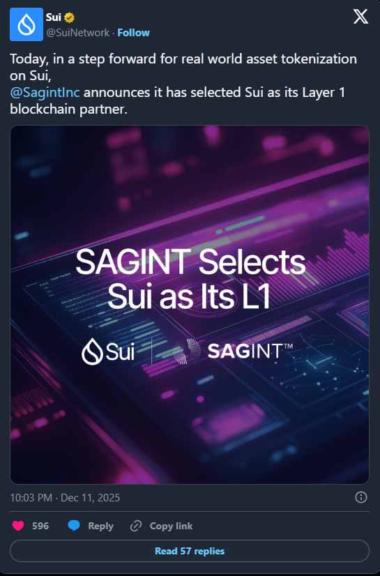 Sui 与 SAGINT 及 ReElement Technologies Corporation 合作,为精炼后的关键及稀土矿物部署基于区块链的代币化方案。这项举措展示了区块链在实物商品上的实际应用,从纯粹的数字资产迈向了现实世界的供应链基础设施。