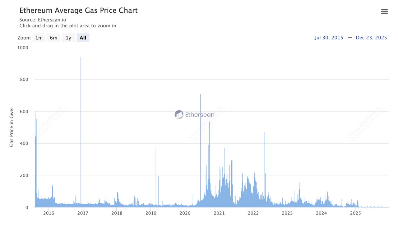 截至2025年12月,目前的Gas价格徘徊在0.034 Gwei左右的极低水平,使得简单的转帐仅需几美分,这与历史高峰形成鲜明对比。2024年具有变革性的Dencun升级将平均费用削减了高达95%,从升级前的70 Gwei以上降至2025年大部分时间持续低于3 Gwei的水平,而Layer 2 网络现在处理大部分活动,费用通常低于0.01美元。这份新手指南将探讨ETH Gas和Gwei的基础知识,并提供最新的事实、数据和策略,以帮助新手在以太坊不断演进以实现更高可扩展性和可负担性的过程中,有效率地驾驭其费用系统。