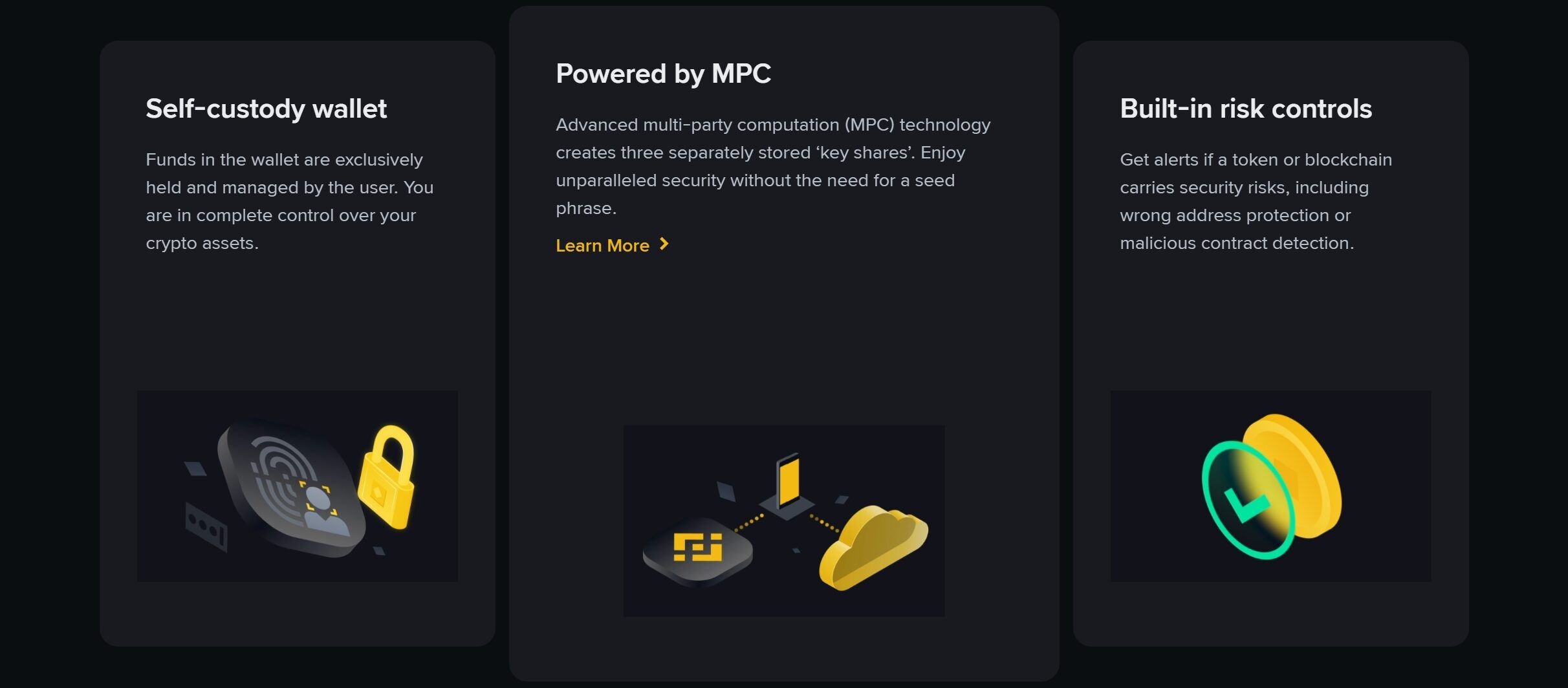 | 恢复 | 没有传统的种子短语;恢复过程与 MPC 流程相关。 | 通过币安标准流程恢复账户 |
