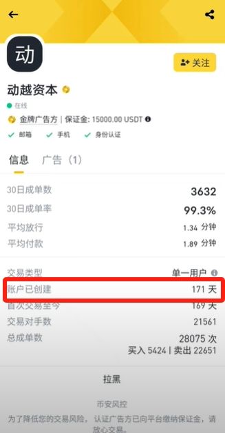 我们可以看到这个账户已经创建多长时间了,171天半年左右。我们尽量就要找那些注册时间比较长的老商家,像这个商家半年左右其实不是特别的稳定,因为一般来说商家的账号注册时间越久,就证明他的资产越安全。