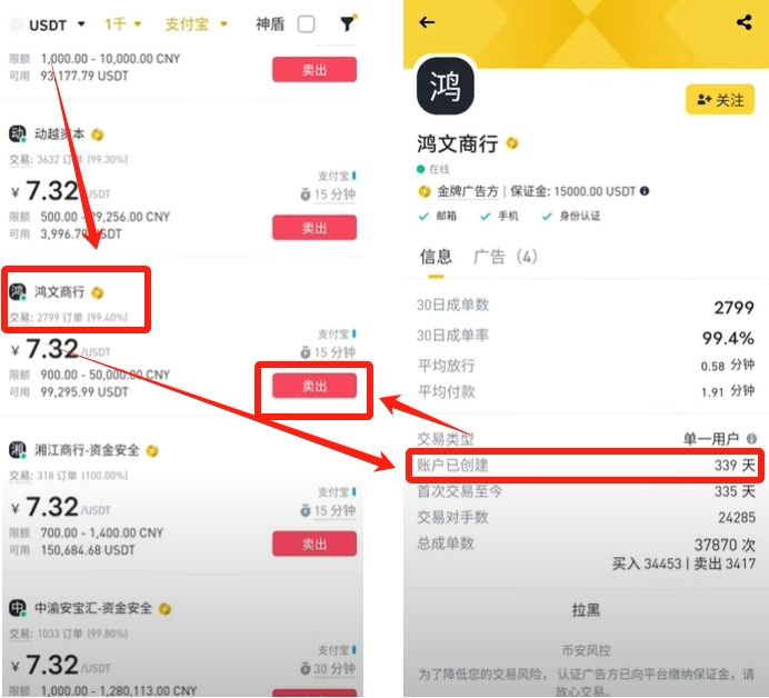 我们就可以再去看一个别的商家,比如说“鸿文商行”这一家,这个账户已经创建339天快一年了,针对这个情况的话,就比刚才的哪个商家强。我们确定好跟他交易之后,就可以点击这里的【卖出】。