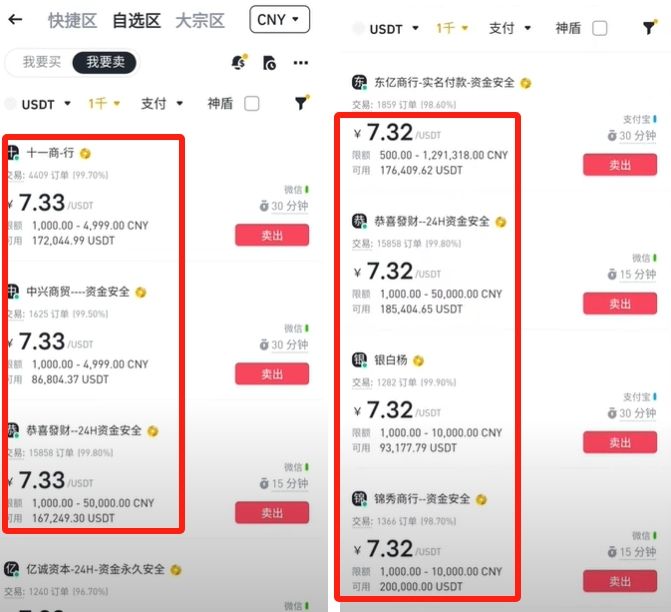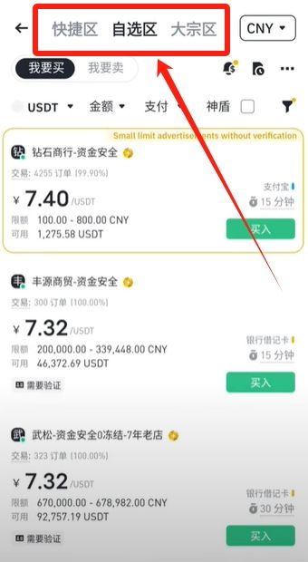 进来之后我们就可以看到上方这里分为三个区域,快捷区、自选区以及大宗区。这个时候大家就要注意,我们出金一定不要选择这个快捷区,快捷区的匹配机制就是卖币的时候谁报价高,这个单子就给谁。所以很多坏人就会利用这个漏洞来和我们交易,所以我们最好根据自己的要求,自行去挑选一个靠谱的商家。