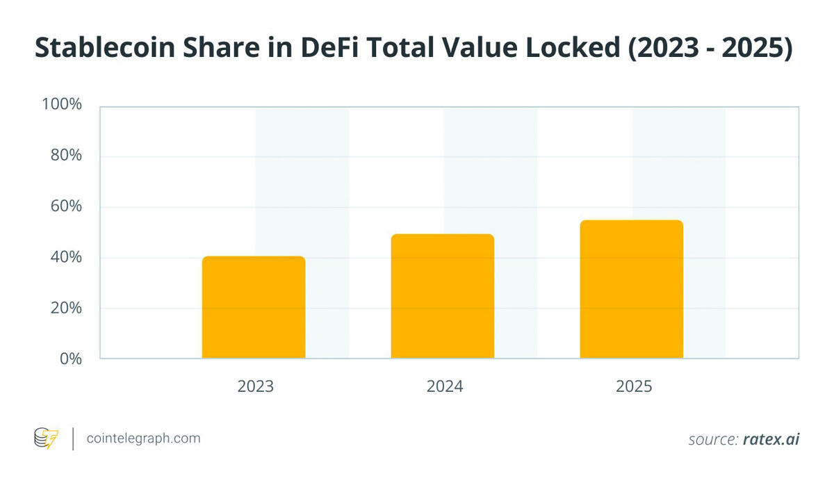 稳定币在去中心化金融(DeFi)堆栈中发挥着核心作用。主要协议如Aave和Curve围绕稳定币构建其核心贷款和交易池,因为它们提供可预测的、低波动性的抵押品。开发商也在试验产生收益的稳定资产,比如Ethena的USDe,这种资产旨在自动产生回报,并将被动货币转化为生产性资本。