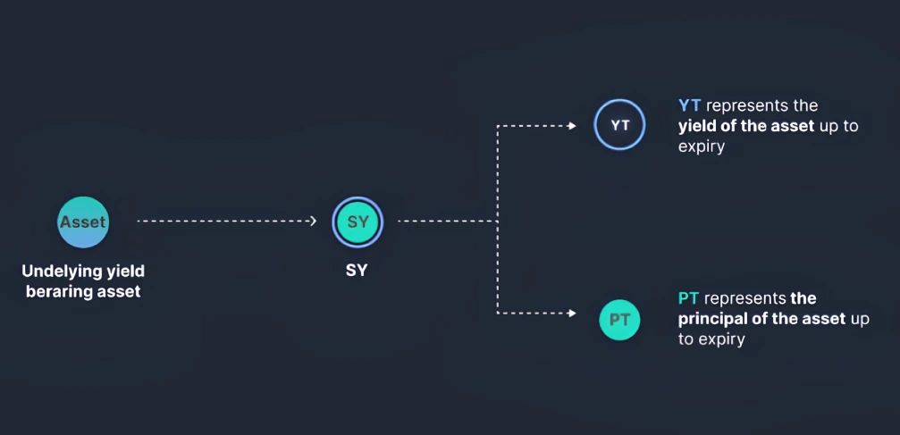 Pendle Finance 允许用户通过将收益资产分割成本金代币 (PT)和收益代币(YT)的独特方式,对未来收益进行代币化和交易。具体操作如下