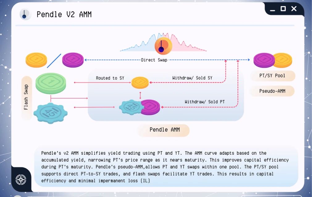 2024 年初,Pendle Finance V2 为简化收益率交易进行了重大升级。通过将 PT 池和 YT 池合并为一个单一的流动性池,V2 减少了资本分散,实现了闪电掉期,使交易更快、更灵活。集中流动性和动态 AMM 曲线现在可随收益率调整,从而最大限度地减少提供商的短期损失。