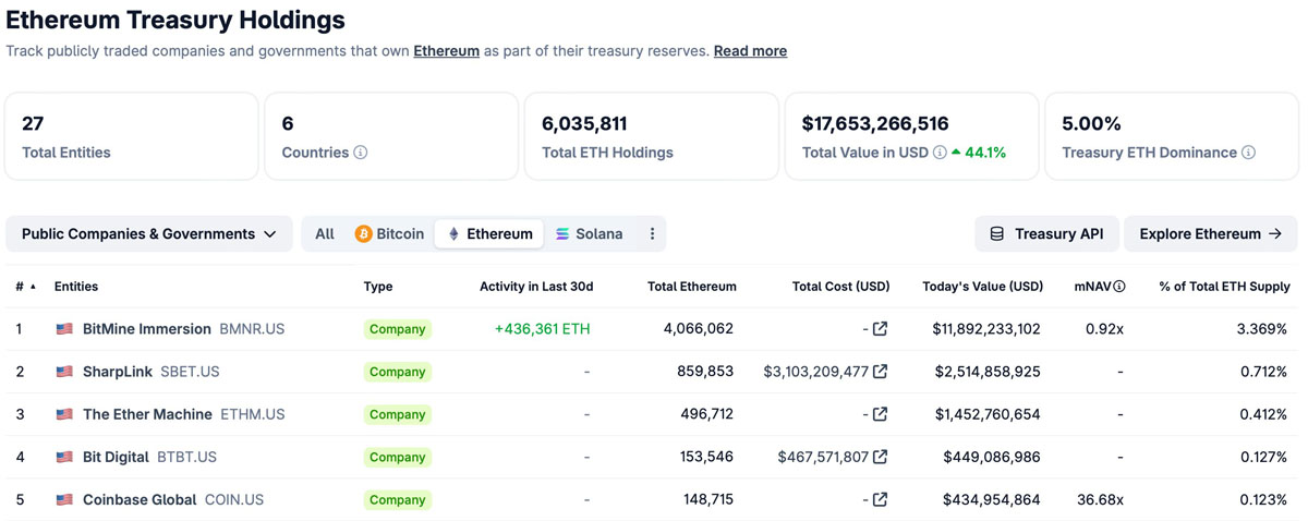 李还担任BitMine Immersion Technologies的董事长,这是一家领先的以太坊专注型资产管理公司,据CoinGecko数据显示,该公司已报告持有4,066,062枚ETH数据.