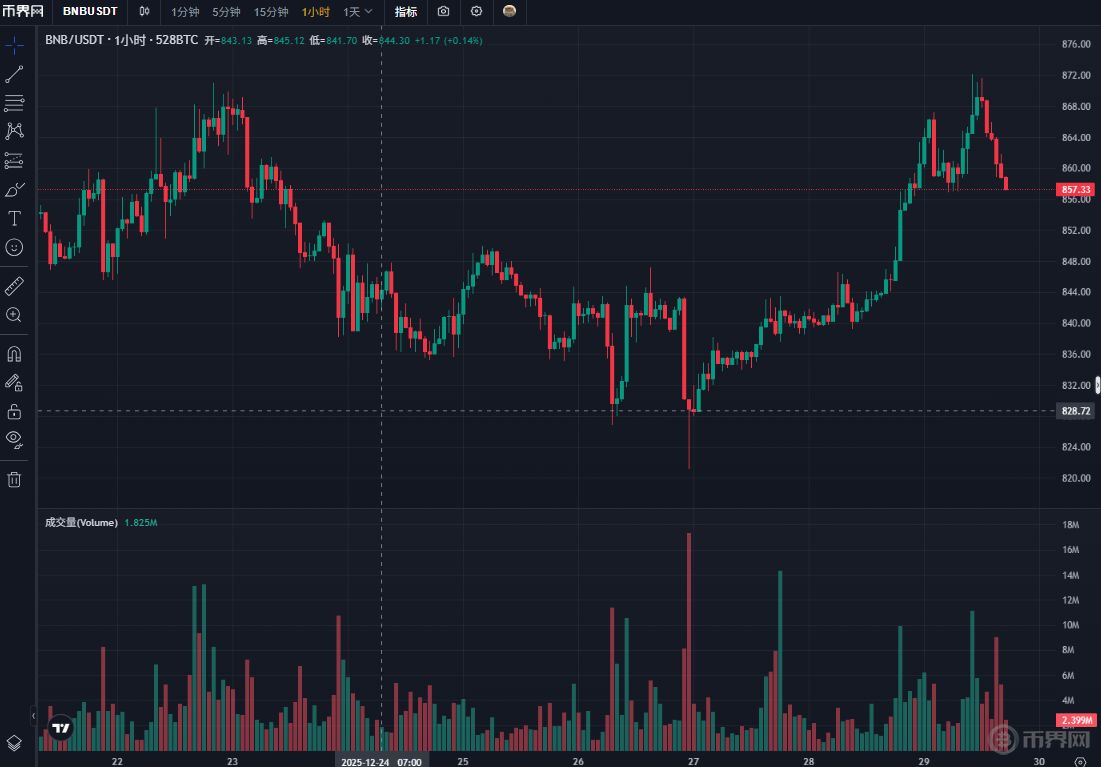 12月29日BNB走势及成交量,来源币界网