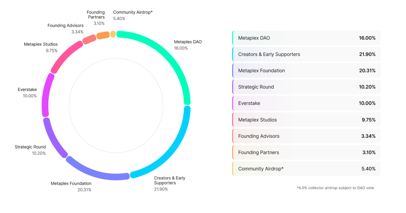 MPLX代币的分配结构旨在支持Metaplex生态系统并奖励早期支持者。最大的一部分将分配给创作者与早期支持者(21.9%)和Metaplex基金会(20.31%),其后是Metaplex DAO(16%)和战略轮投资者(10.2%)。另外,Everstake持有10%,Metaplex Studios为9.75%。少量份额将分配给创始顾问(3.34%)、创始合作伙伴(3.1%)以及社区空投(5.4%)。这一分配结构确保了内核贡献者和社区之间的利益一致性。