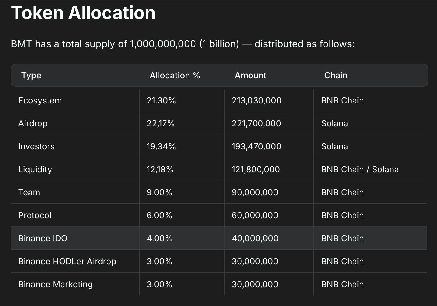 - 流动性:12.18%(121,800,000 BMT,BNB Chain / Solana)