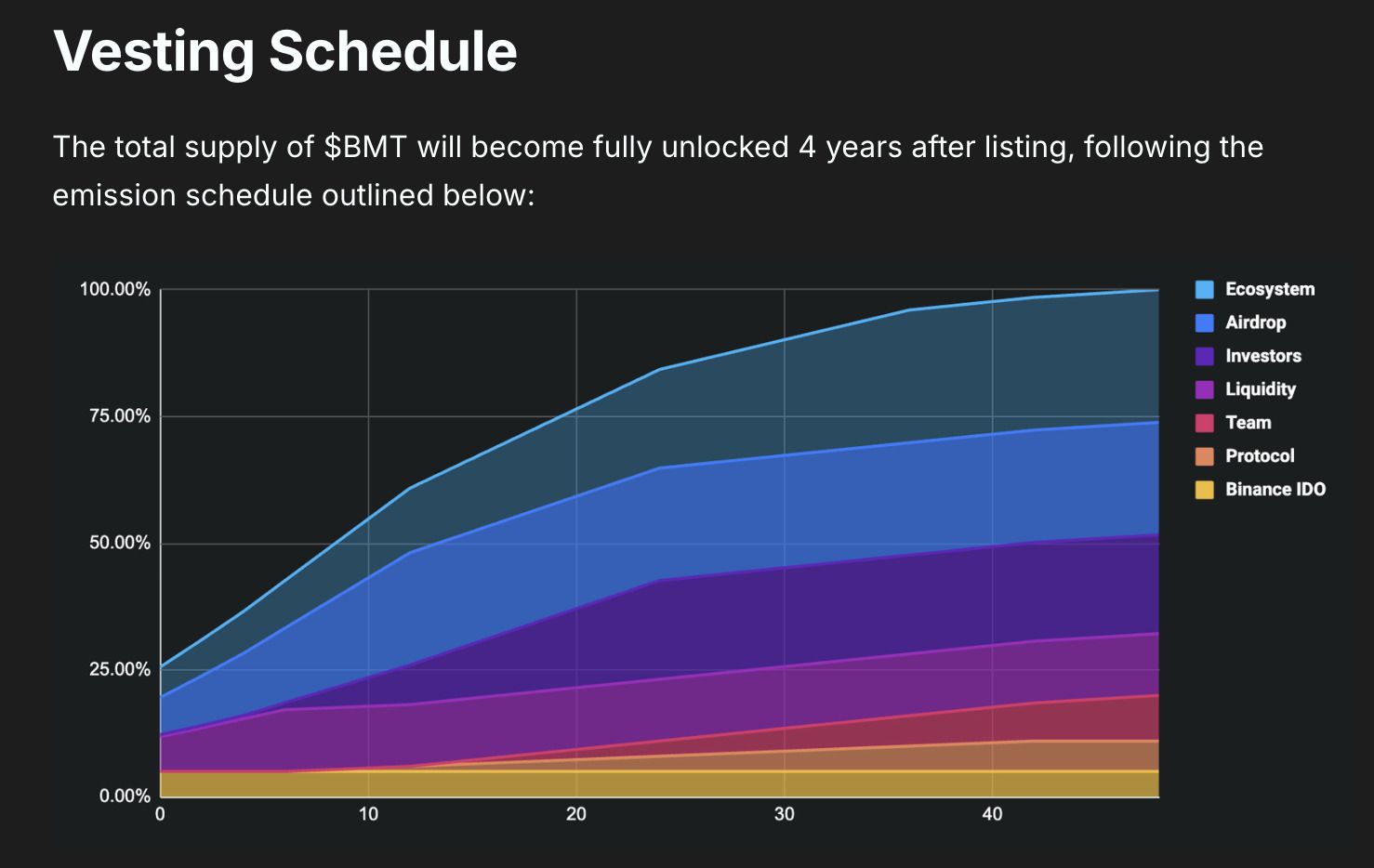 解锁时间表: BMT 代币采用 渐进释放机制,确保市场稳定。预计至 2029 年,所有代币将完全流通。