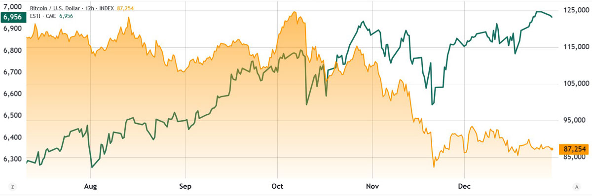 标准普尔500指数期货(左)vs比特币/美元。来源:TradingView
