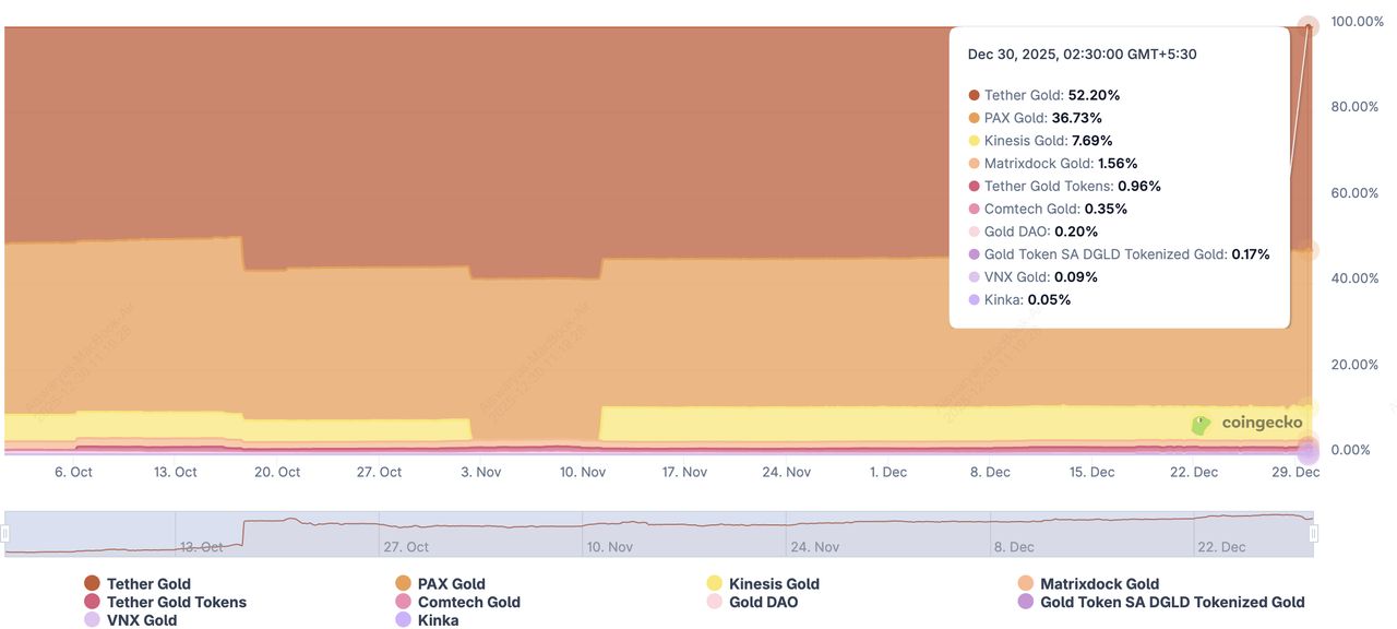 两个项目主导此领域:Tether Gold (XAUT) 和 Pax Gold (PAXG)。截至 2025 年 12 月,它们合计占代币化黄金市场约 90% 的份额,价值超过 43 亿美元。