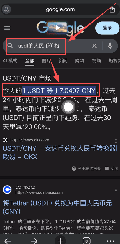 首先,你可以在Google里面搜索“USDT的人民币价格”。它今天告诉你,1usdt等于7.0407人民币。这个价格是不准的,哪怕它是稳定币也不准,我们要以欧易OKX里面的C2C真实的买卖价格为准。