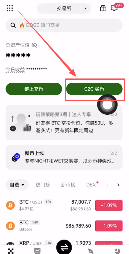 注册好之后,我们打开欧易交易所(点击下载 点击注册)。在欧易交易所的首页点击【C2C买币】。