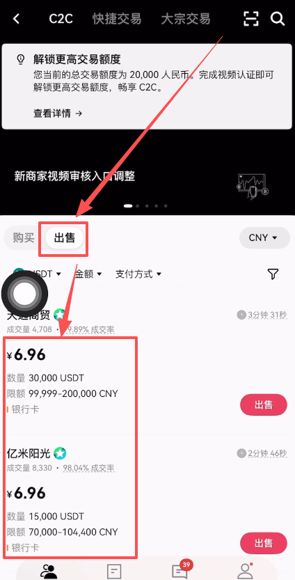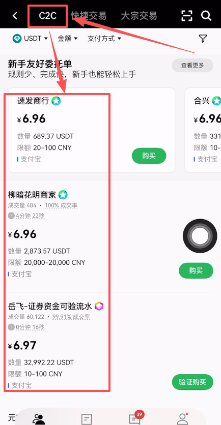 进来之后上方有C2C、快捷交易和大宗交易。我们就使用C2C,就是个人对个人交易。