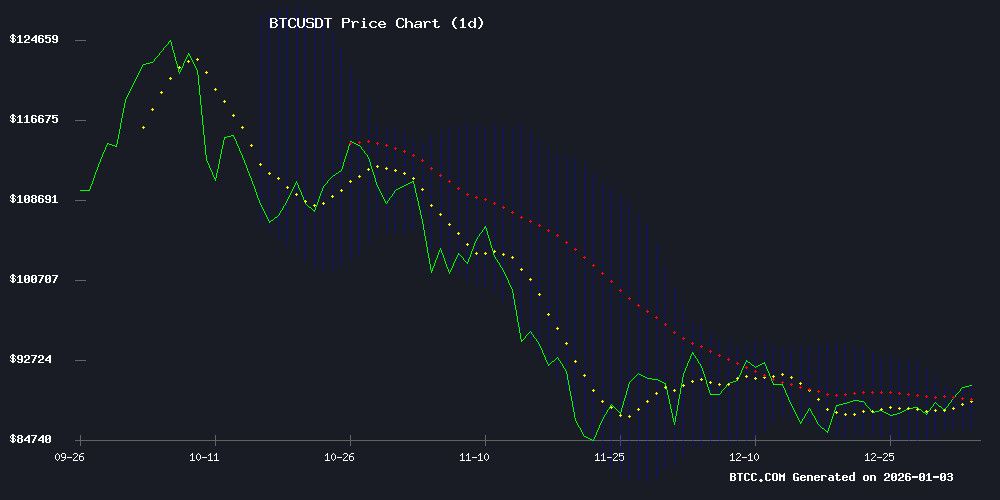 据金融分析师Ava称,BTC目前交易价格为90,093.99 USDT,略高于20日移动平均线87,885.58。价格高于关键移动平均线是初步的技术强势信号。然而,MACD指标仍处于负值区域(-545.94),表明上涨动能尚未完全确认。布尔带显示价格接近上轨(90,069.04),暗示该资产可能正在接近短期阻力区。目前的形态表明市场处于盘整阶段,移动平均线和布尔带下轨(85,702.13)附近存在强劲支撑。如果价格能够持续收于90,000 USDT上方,则可能为测试新高铺平道路。