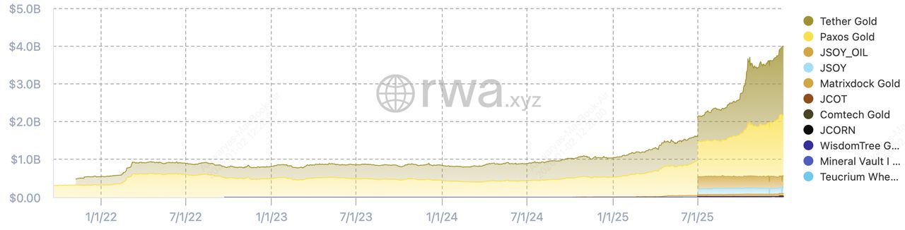 2025 年,代币化黄金仍是市值主导资产,该领域超过 44 亿美元,这得益于 Tether Gold (XAUT) 和 Pax Gold (PAXG) 等产品的持续资金流入。黄金的强势反映了其在货币政策宽松、地缘政治不确定性和央行持续累积下的宏观对冲作用。2025 年 12 月,现货黄金价格飙升至每盎司 4,500 美元以上,巩固了黄金在代币化商品市场中作为主要价值保存的地位。