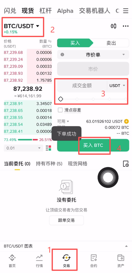 购买完USDT之后点击下方中间的【交易】按钮,在上方这里选择比特币。然后输入你要购买的金额,点击【买入BTC】就可以购买成功了。