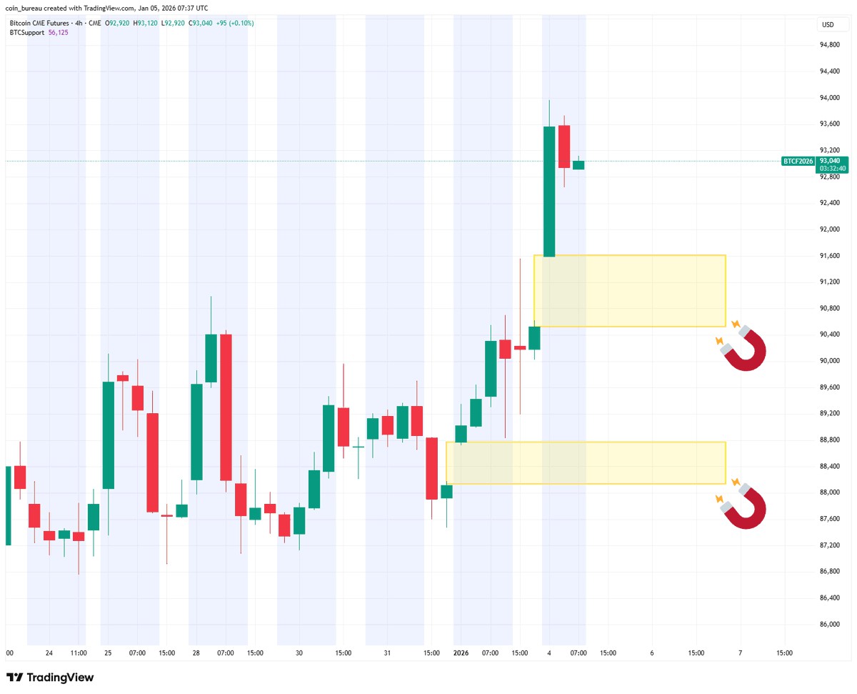 “两个CME期货合约缺口分别位于90,500至91,600美元以及88,200至88,800美元的价位下方,”比特币教育资源Coin Bureau证实道。