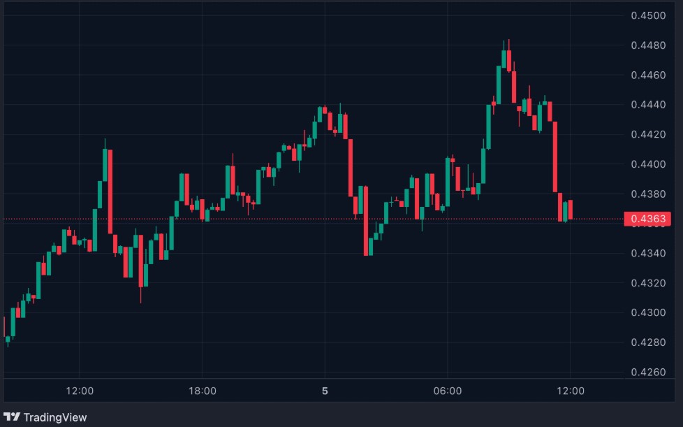 从技术角度来看,ONDO在从之前的周期高点大幅回调后,已经形成了一个区间结构。买家在$0.43到$0.44的支撑区域附近显得活跃,而卖家则一直在坚守更高的水准。