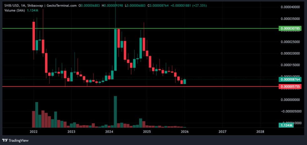 如果这一结构保持不变且更广泛的市场条件改善,Shiba Inu 可能会朝更高水平发展,在有利的流动性条件下,2026年的潜在目标约为0.00003。