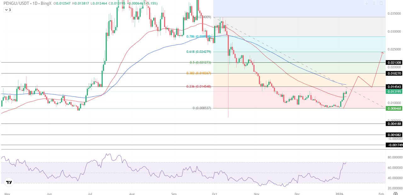 日线图显示,PENGU在长期回调后出现前期企稳信号。代币成功守住0.0085–0.0100美元需求区,其后录得看涨吞没K线并形成更高低点,显示抛压已逐步减退价格。重新站上短期EMA,并正逼迫近下行的50日EMA。