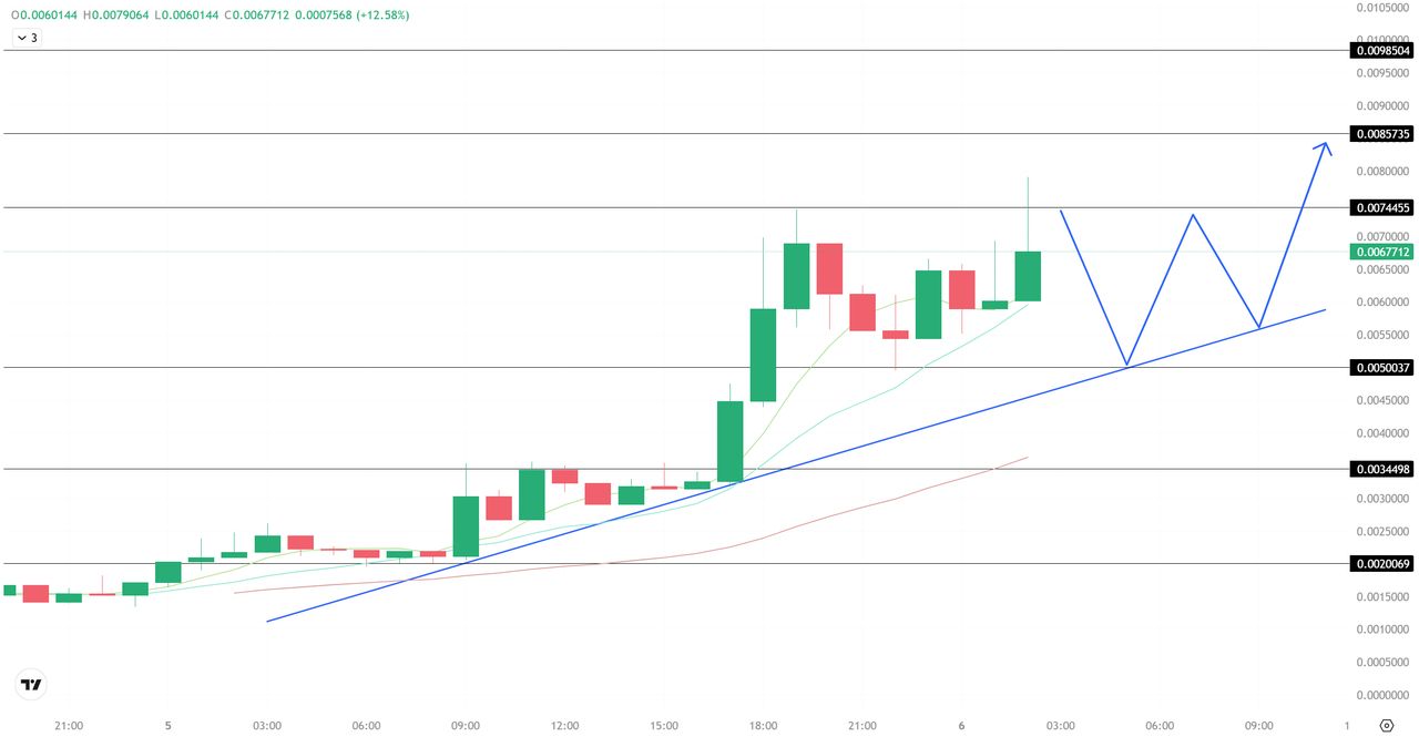 短期均线正位于长期均线上方并向上倾斜,而RSI虽处于偏高但未达到极限水平,显示动能尚未明显透支。价格能持续升破0.00745美元,或将打开接近0.00857美元的空间;一旦跌破0.00500美元,则忽视这一看涨结构。若技术上可关注至约0.0052美元的机会,向0.0085 美元目标推进,而若跌穿 0.0050 美元,则意味着原有设置无效。