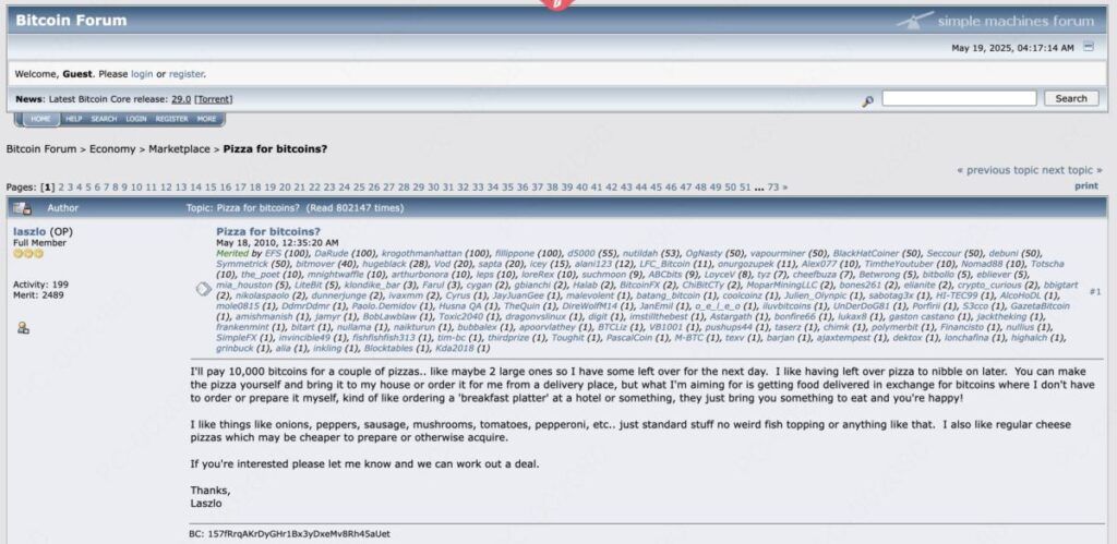2010年5月,当比特币仍处于起步阶段时,拉兹洛·哈尼茨在Bitcointalk论坛上发布了一条消息,这条消息将永远改变加密货币历史。 他的帖子写道:”我愿意用10,000个比特币换取一对比萨饼……也许是两张大的,这样我可以留一些到第二天。”
