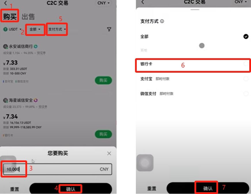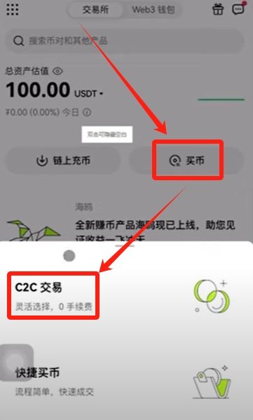 如果没有买币的按钮,我们可以点击左上角的九个点,然后选择“C2C交易”。一定不要选择旁边的买币,因为买币是系统随机分配的,很有可能遇到骗子。我们选择C2C交易,自己去筛选。