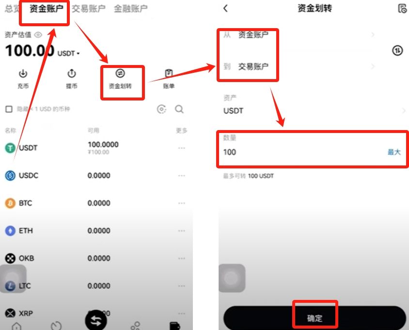 简单的来给大家解释一下。资金账户只是说明我们账户里面有USDT,但是不能去交易。交易账户顾名思义是交易使用的,钱放在里面可以用来交易。我们的钱现在是在资金账户,所以我们想去交易的话,需要把资金账户里面的钱放到交易账户。我们点击资金账户,点击【资金划转】,从资金账户到交易账户,数量选择最大,点击【确定】。划转是不收任何手续费的。