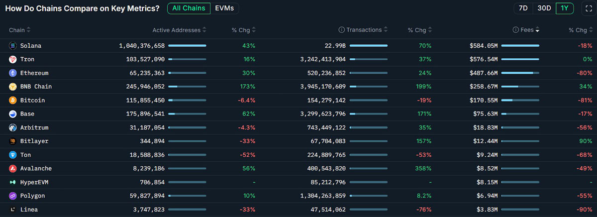 根据加密货币情报平台Nansen的数据,过去一年,Solana以5.85亿美元的费用收入位居区块链榜首,而排名第二的Tron则实现了5.76亿美元的收入。