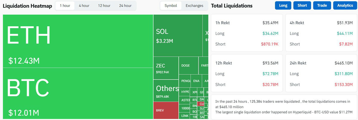 来自 CoinGlass 清算图表的数据 显示,在过去的 24 小时内,超过 12.5 万名交易者损失了他们的仓位,总损失金额为 4.6508 亿美元。最大单笔清算是在 Hyperliquid 上的 1.127 亿美元的 BTC-USD 仓位,这增加了卖方压力。
