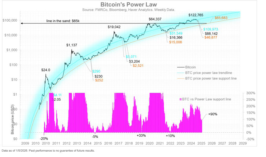 比特币幂律分析得出结论,如果比特币在2026年以盘整年收官,其价格可能将在65,000美元附近迎来新一轮较量。