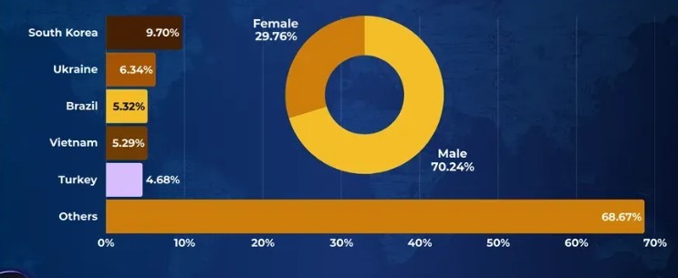 根据Similarweb数据显示,币安月访问量达7700万次,其中韩国以9.7%的流量占比位居首位。紧随其后的是乌克兰(6.34%,尽管存在限制)、巴西(5.32%)、越南(5.29%)和土耳其(4.68%)。其余全球地区合计贡献了68.67%的月访问量。