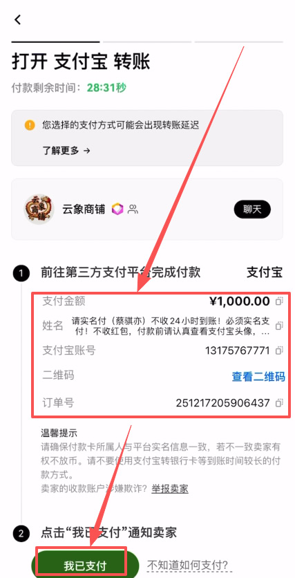 在这里商家的姓名、支付宝账号、还有他的收款二维码都会显示出来,这就需要我们离开平台,去到支付宝里面,根据商家提供的信息,按照他的要求去给他转账了。