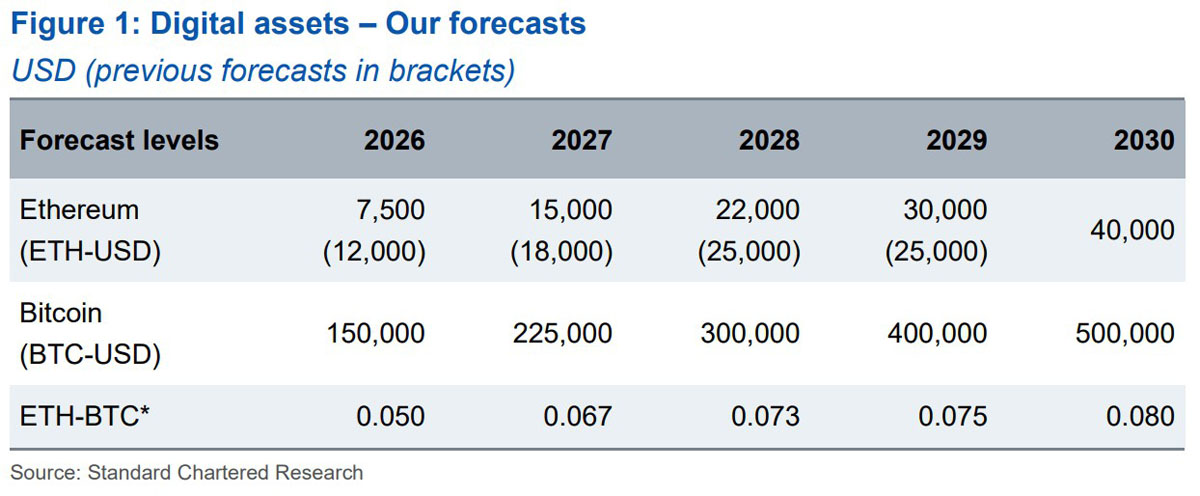 渣打银行对比特币和以太币的定价预测。来源:渣打银行