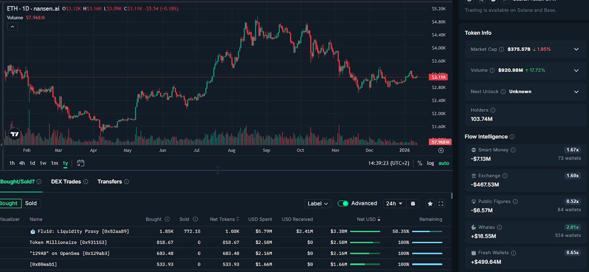 以太坊/美元,一年图表,按群体划分的代币流动。来源:Nansen