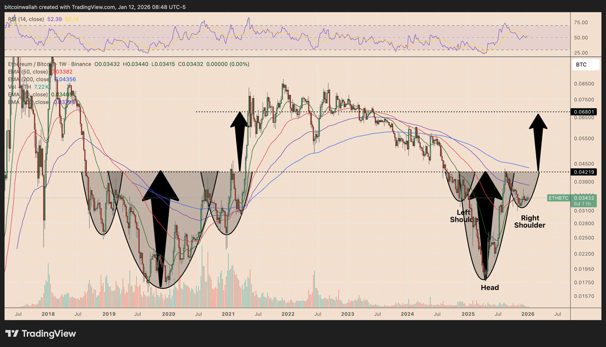 截至周一,以太币似乎正在ETH/BTC图表上构筑一个正在形成的反向头肩形态的右肩。