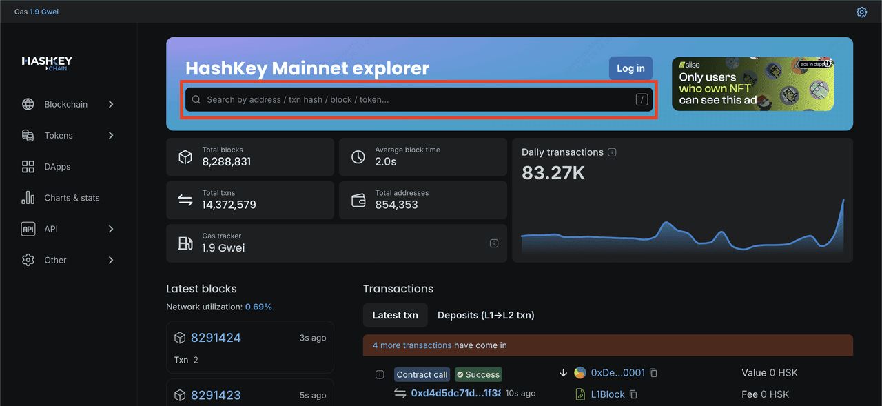 领取后,您的HSK 代币将被发送到您在HashKey Chain 上连接的钱包。您可以在HashKey Blockscout上验证交易。